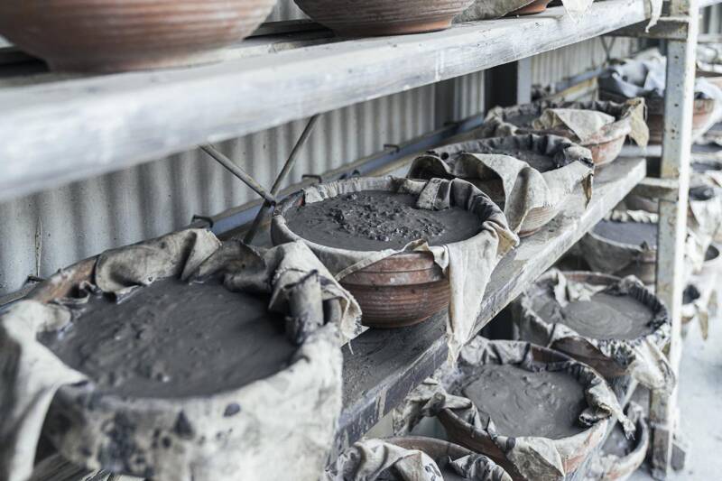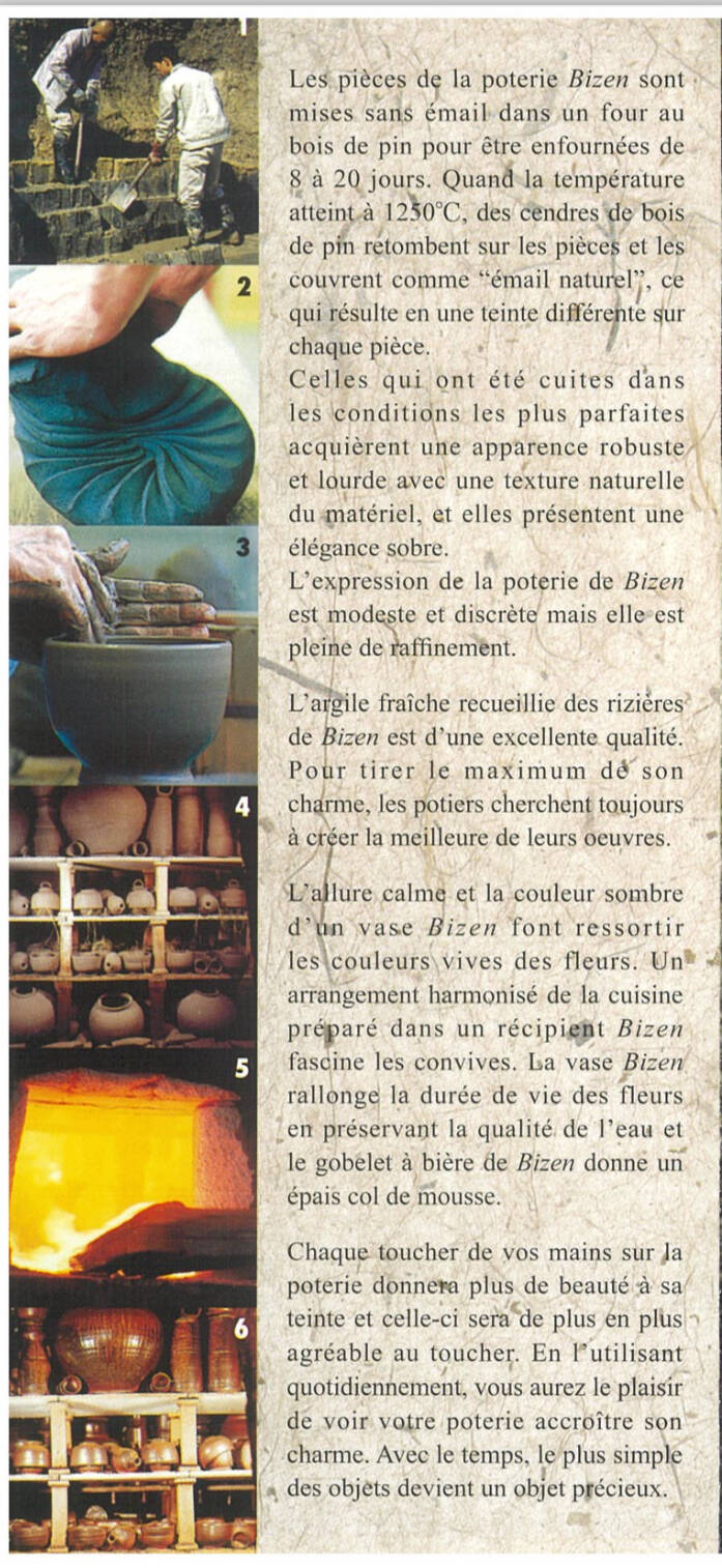 Chaque pièce est façonnée à la main ou formée sur un tour de potier, séchée et cuite sans glaçure à des températures dépassant les 1 200 degrés Celsius. Cela produit une céramique si résistante qu'on dit souvent qu'elle ne se brise pas même si on la jette. La couleur de la céramique de Bizen change en fonction des ingrédients de l'argile, de la température du four, de l'emplacement de la pièce dans le four et des caractéristiques de la cendre. Cela signifie que deux pièces ne sont jamais identiques.